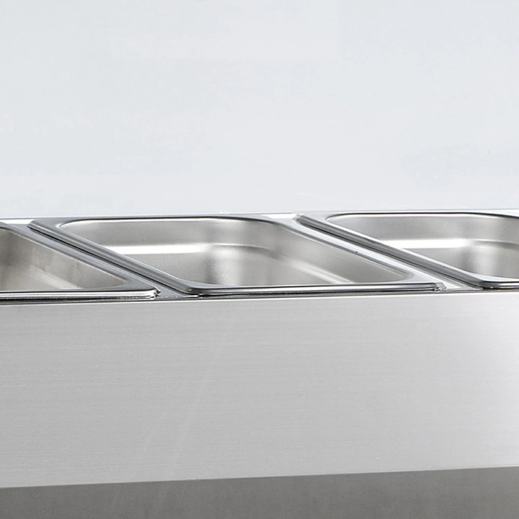 • Вместимость — 5×GN 1/4, глубина 150 мм, удобно для салатов и закусок.