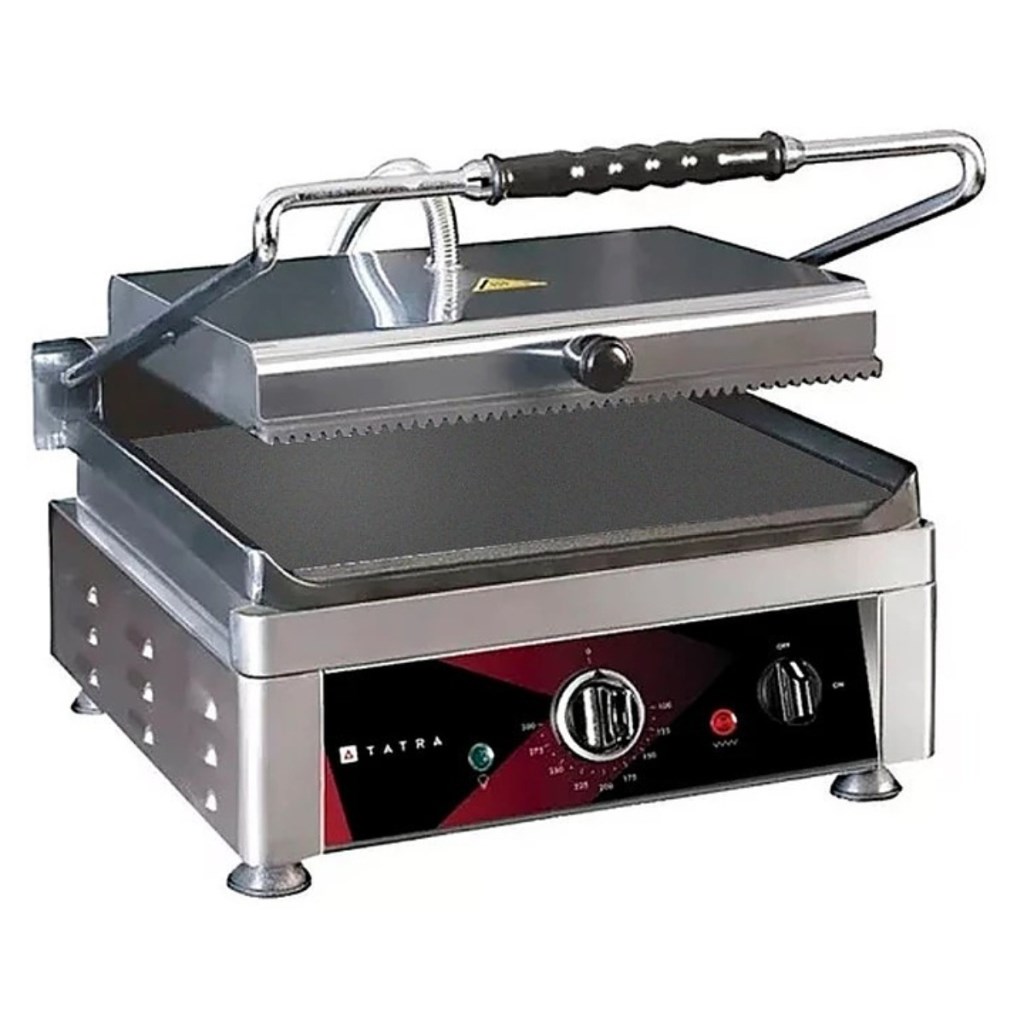 Гриль контактный Tatra TCG 4527 RS предназначен для профессионального приготовления мяса, рыбы, птицы, овощей и разогрева полуфабрикатов на предприятиях общественного питания и торговли. Модель оборудована надежной электромеханической панелью управления с терморегулятором и индикаторами питания и нагрева. Для удобства эксплуатации предусмотрена ёмкость для сбора жира. Конструкция выполнена из прочной нержавеющей стали, что обеспечивает долговечность и простоту ухода.