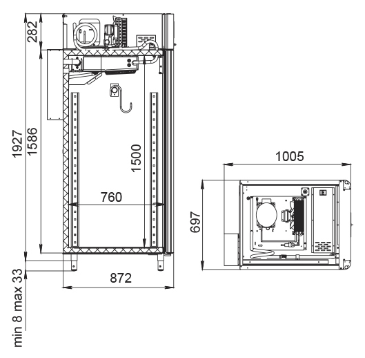 Каталог оборудования Холодильное оборудованиеШкафы холодильныеСпециализированные холодильные шкафыШкаф холодильный для вызревания мяса Polair CS107 Meat черный, со стеклом (Тип 2) Шкаф холодильный для вызревания мяса Polair CS107 Meat черный, со стеклом (Тип 2) Код товара: 062-633 Поделиться: WhatsAppTelegram СравнитьДобавить в КПВ избранное 0 392 700 ₽ В корзину 0 шт Под заказСамовывоз сегодня бесплатно Взять в кредит Купить в лизинг Получить консультацию в WhatsApp Описание Характеристики Отзывы 0 Инструкции 5 Шкаф холодильный для вызревания мяса Polair CS107 Meat черный, со стеклом (Тип 2) предназначен для создания оптимальных условий хранения и дозревания мяса на предприятиях общественного питания и торговли. Монолитный цельнозаливной корпус выполнен снаружи и на двери из окрашенной стали, внутри — из нержавеющей стали, дверь оснащена стеклопакетом. Оборудование рассчитано на работу при температуре окружающей среды до 40 °С. Особенности: Верхнее расположение агрегата для эффективного распределения холода Многофункциональная русифицированная панель управления с дисплеем диагональю 5" Возможность создания и сохранения собственных программ в памяти электронного блока Четыре перфорированные полки для удобного размещения продукции Встроенный ультразвуковой увлажнитель (требуется подключение к системе очищенной воды и централизованной канализации) UV-лампа для обеззараживания воздуха, обеспечивающая санитарную безопасность Распашная дверь с заливной теплоизоляцией и сменным уплотнителем с магнитной вставкой Встроенная удобная ручка Отключаемая внутренняя LED-подсветка Штампованное углубление в дне корпуса для удобства уборки Педаль для бесконтактного открывания двери Максимальная нагрузка на полку — 40 кг Толщина стенок корпуса — 43 мм Polair CS107 Meat черный, со стеклом (Тип 2) — это надежный и функциональный холодильный шкаф, который обеспечивает стабильные и комфортные условия для хранения и дозревания мяса. Высококачественные материалы корпуса и дверей, продвинутые системы увлажнения и обеззараживания воздуха, а также удобное управление позволяют значительно повысить качество продукции и эффективность работы предприятий пищевой отрасли.Изображение товара, представленного на фото, может отличаться от его фактического вида. Показать все Габаритные размеры697×1005×1960 ммДиапазон рабочей температурыот -2 до +30 °CДлина697 ммШирина1005 ммВысота1960 ммОбъём700 лКол-во дверей1 Тип двериСтеклянная Количество полок4 штДопустимая нагрузка на полку40 кгУровень влажностиот 60 до 95 %Холодильный агрегатВстроенный Тип оттайкиАвтоматическая Тип охлажденияДинамическое ПодсветкаЕсть UV-лампаЕсть ХладагентR290 Вес нетто160 кгВес брутто190 кгБрендPolairВсе специализированные холодильные шкафы Из нержавейкиВсе специализированные холодильные шкафы Стеклянная дверь Оставить отзыв Еще никто не оставил отзыв на этот товар Схема POLAIR CS107-Meat.jpgИнструкция на POLAIR CS107-Meat.pdfБрошюра на POLAIR CS107-Meat.pdfДекларация о соответствии.pdfСертификат соответствия.pdf Похожие товары Перейти в каталог Под заказ 402 050 ₽ Шкаф холодильный для вызревания мяса Polair CS107 Meat со стеклом (Тип 2) Под заказ 373 915 ₽ Шкаф холодильный для вызревания салями Polair CS107 Salami черный, со стеклом Под заказ 385 050 ₽ Шкаф холодильный для вызревания салями Polair CS107 Salami со стеклом Под заказ 392 700 ₽ Шкаф холодильный для вызревания мяса Polair CS107 Me