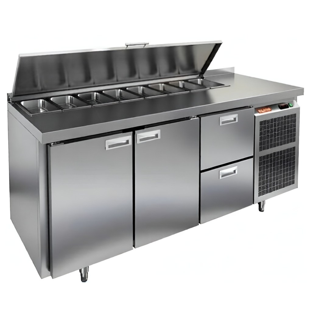 Каталог оборудования Холодильное оборудованиеСтолы охлаждаемыеСтолы холодильные для салатовСтол холодильный для салатов HiCold SL1-112GN (1/3) с крышкой Стол холодильный для салатов HiCold SL1-112GN (1/3) с крышкой Код товара: 064-841 Поделиться: WhatsAppTelegram СравнитьДобавить в КПВ избранное 0 198 892 ₽ В корзину 0 шт Под заказСамовывоз сегодня бесплатно Взять в кредит Купить в лизинг Получить консультацию в WhatsApp Описание Характеристики Отзывы 0 Инструкции 2 Стол холодильный для салатов HiCold SL1-112GN (1/3) предназначен для использования на предприятиях общественного питания и торговли. Он объединяет рабочую поверхность и охлаждаемый отсек, что делает его удобным решением для хранения, охлаждения и подготовки ингредиентов при приготовлении салатов, пиццы и других блюд. Такая конструкция позволяет повару работать быстрее и эффективнее, так как все необходимые продукты находятся под рукой. Корпус и столешница выполнены из прочной нержавеющей стали, устойчивой к коррозии и легко поддающейся санитарной обработке. Металлическая крышка защищает продукты от загрязнений и сохраняет их свежесть. Особенности модели: Электронная панель управления — точная настройка температурного режима. 2 глухие двери — удобный доступ к холодильному отсеку. 2 выдвижных ящика — быстрое размещение и замена продуктов. Вместимость салат-бара — до 8 гастроемкостей глубиной до 100 мм. Автоматические доводчики дверей с фиксацией в открытом положении. Легкозаменяемые магнитные уплотнители — надежная герметичность. Открытая агрегатная часть — быстрый доступ для обслуживания. Регулируемые по высоте ножки — устойчивость даже на неровном полу. Толщина столешницы, борта и теплоизоляции — 50 мм, что обеспечивает прочность и энергоэффективность конструкции. HiCold SL1-112GN (1/3) — практичное и удобное решение для профессиональной кухни, обеспечивающее удобную подготовку и хранение ингредиентов.Изображение товара, представленного на фото, может отличаться от его фактического вида. Показать все Габаритные размеры1835×700×850 ммДиапазон рабочей температурыот +2 до +10 °CРасположение агрегатаБоковое Материал столешницыНержавеющая Тип столаС дверьми и ящиками Тип двериГлухая Объём505 лКоличество дверей2 штТип гастроемкостейGN 1/3 Количество ящиков2 штРазмер полки530×325 ммНапряжение220 ВМощность0,46 кВтТип охлажденияДинамическое Тип оттайкиАвтоматическая СтолешницаС бортом Вес нетто120 кгВес брутто140 кгБрендHicold Оставить отзыв Еще никто не оставил отзыв на этот товар Паспорт на HICOLD SL1-112GN.pdfДекларация о соответствии.pdf Ранее просмотрено Под заказ 168 291 ₽ Стол холодильный для салатов HiCold SL1-111GN (1/3) O с крышкой