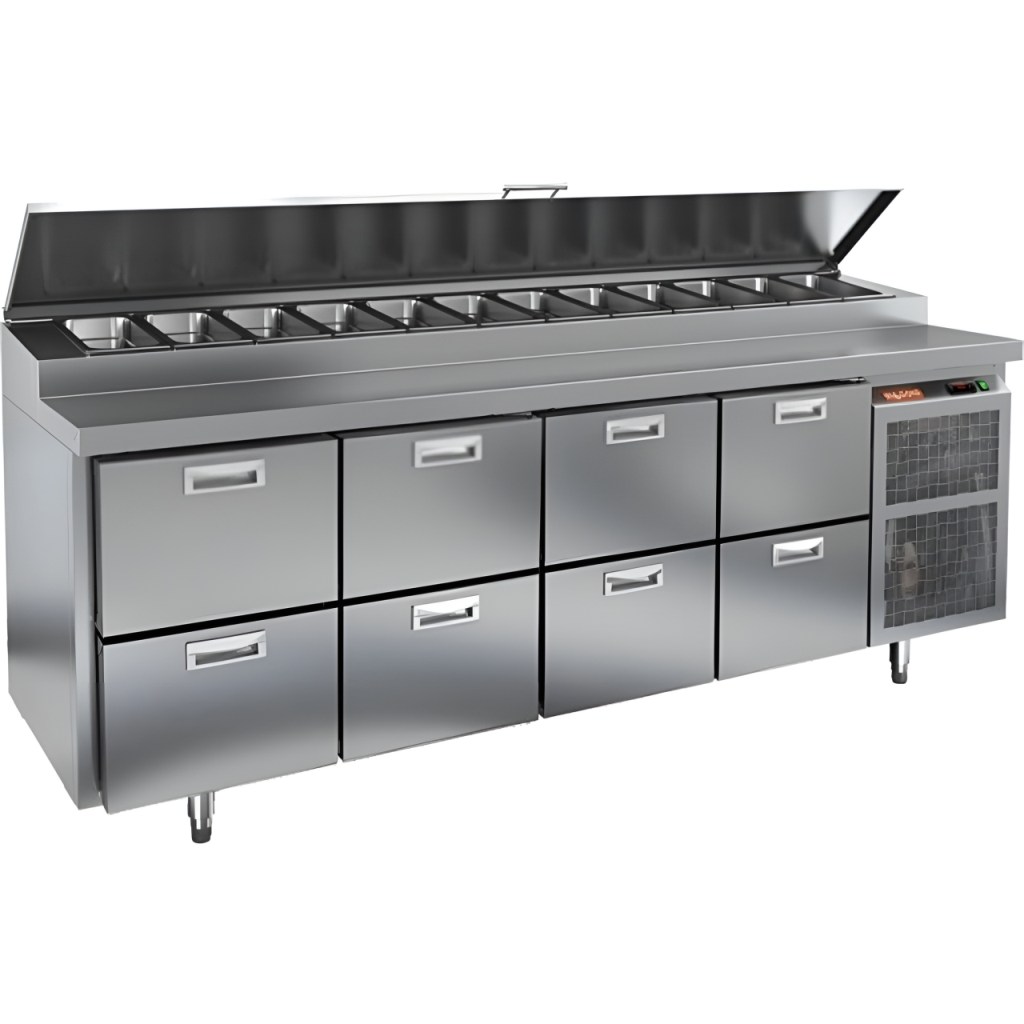 Каталог оборудования Холодильное оборудованиеСтолы охлаждаемыеСтолы холодильные для пиццыСтол холодильный для пиццы HiCold PZ1-2222GN (1/3H) Стол холодильный для пиццы HiCold PZ1-2222GN (1/3H) Код товара: 064-713 Поделиться: WhatsAppTelegram СравнитьДобавить в КПВ избранное 0 373 042 ₽ В корзину 0 шт Под заказСамовывоз сегодня бесплатно Взять в кредит Купить в лизинг Получить консультацию в WhatsApp Описание Характеристики Отзывы 0 Стол холодильный для пиццы HiCold PZ1-2222GN (1/3H) — профессиональное оборудование для предприятий общественного питания и торговли. Он сочетает рабочую поверхность для раскатки теста и подготовки ингредиентов с охлаждаемым блоком для кратковременного хранения скоропортящихся продуктов и напитков. Такое решение обеспечивает максимальное удобство — все необходимые компоненты всегда находятся под рукой. Корпус и столешница выполнены из нержавеющей стали, что гарантирует долговечность, устойчивость к повреждениям и лёгкость ухода. Основные особенности: Нержавеющая столешница и корпус — прочность, гигиеничность и лёгкость очистки Динамическая система охлаждения — равномерное распределение холода Автоматическая оттайка — стабильная работа без образования наледи Электронная панель управления — точная настройка температуры 8 выдвижных ящиков — удобная организация внутреннего пространства без дверцы Автоматические доводчики ящиков — комфорт при работе Легкозаменяемые магнитные уплотнители — поддержание герметичности Открытая агрегатная часть — лёгкий доступ для обслуживания Регулируемые по высоте ножки — установка на неровных поверхностях Максимальная глубина гастроёмкостей: 100 мм Глубина рабочей поверхности: 324 мм Толщина столешницы и теплоизоляции: 50 мм Вместимость салат-бара: до 12 гастроёмкостей Стол холодильный HiCold PZ1-2222GN (1/3H) — надёжный и функциональный холодильный стол для пиццы и салатов. Отсутствие дверцы и продуманная система хранения обеспечивают быстрый доступ к ингредиентам, удобство эксплуатации и высокую производительность на профессиональной кухне.Изображение товара, представленного на фото, может отличаться от его фактического вида. Показать все Габаритные размеры2280×700×1000 ммДиапазон рабочей температурыот +2 до +10 °CРасположение агрегатаБоковое Материал столешницыНержавеющая Тип столаС ящиками Объём660 лТип гастроемкостейGN 1/3 Количество ящиков8 штНапряжение220 ВМощность0,5 кВтТип охлажденияДинамическое Тип оттайкиАвтоматическая Габариты в упаковке2420×850×1080 ммВес нетто170 кгВес брутто236 кгБрендHicoldВсе холодильные столы для пиццы HicoldВсе нержавеющие холодильные столы для пиццы Оставить отзыв Еще никто не оставил отзыв на этот товар Ранее просмотрено Под заказ 191 782 ₽ Стол холодильный для пиццы HiCold PZE1-111GN (1/3) З Под заказ 297 352 ₽ Стол холодильный для пиццы HiCold PZ3-112/GN камень Под заказ 268 552 ₽ Стол холодильный для пиццы HiCold PZ3-13/GN камень Под заказ 263 692 ₽ Стол холодильный для пиццы HiCold PZ3-13/SN камень