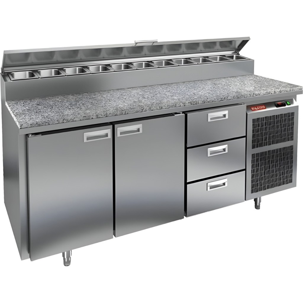 Стол холодильный для пиццы HiCold PZ2-113/GN (1/6) камень предназначен для кухонь и предприятий общественного питания. Он используется для раскатки теста, подготовки ингредиентов для пиццы, салатов и других блюд, а также для охлаждения и кратковременного хранения скоропортящихся продуктов. Модель совмещает гранитную рабочую поверхность и охлаждаемый отсек с 2 дверьми и 3 ящиками, обеспечивая удобный доступ к ингредиентам и эффективное хранение.