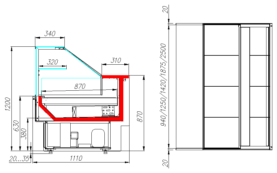 Витрина оснащена регулируемыми ножками (20–35 мм), а поверхность выкладки и столешница выполнены из шлифованной нержавеющей стали.